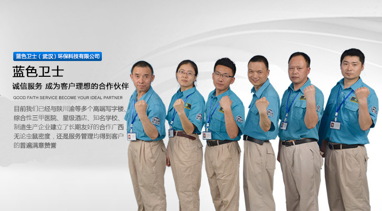 蓝色卫士(武汉)环保科技有限公司致力于为客户开展整体化室内环保服务的专业科技公司。公司采用先进的“整体化室内环保”理念,为客户提供有害生物防制(鼠、蟑、蚊、蝇、蚤、蚁、虱、蜱、螨、蠹虫等)、消毒灭菌、专业咨询、培训、评估。公司拥有资深专家和技能娴熟的专业队伍,为高标准服务于客户提供了技术保障。杀虫灭鼠制剂均选自新型环保产品,高效低毒,减少了环境污染,保障人体安全。